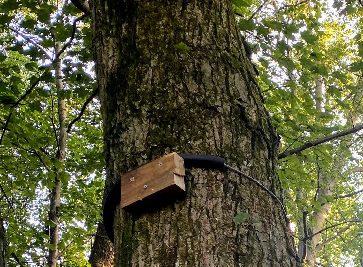 - Place wooden blocks on the trees, under the zip line to prevent it from rolling down